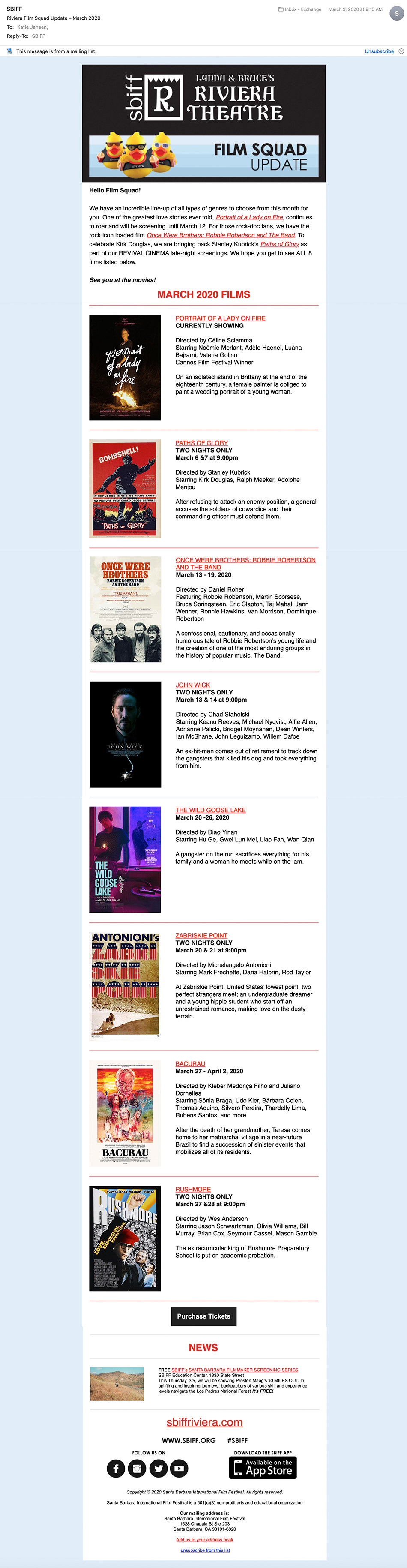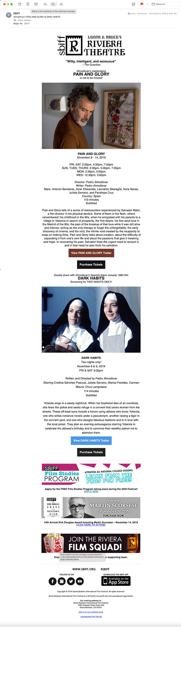 I have 10+ years experience in designing email layouts using Dreamweaver and many email platforms. For SBIFF, we would send out daily emails focusing on the Festival, Riviera Theatre, fundraising, education programs, films, and more. I do like to create more eye-catching graphics and catchy titles.